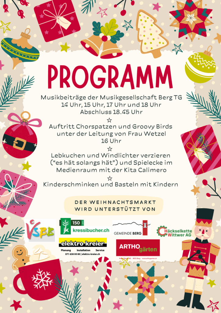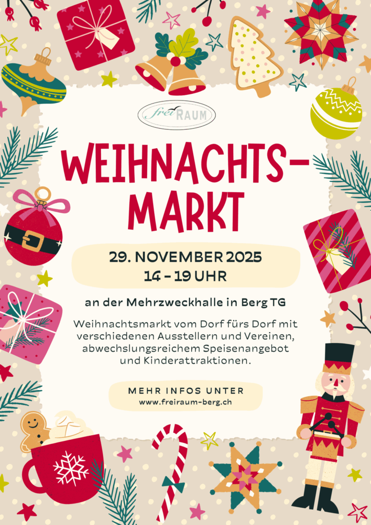 Dies und vieles mehr findet ihr am Samstag, 29.11.2025 am Weihnachtsmarkt in der Mehrzweckhalle Berg von 14 – 19 Uhr.